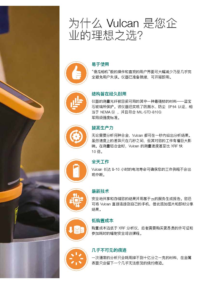 Vulcan 是一款耐用且分析速度極快的合金分析儀。扣扳機后一秒即會顯示結果。且產品使用激光誘導擊穿光譜技術 (LIBS),您無需擔心X射線的影響。無論您的業務是廢料分選還是 PMI 質量控制,Vulcan 始終提供準確且一致的合金 牌號。