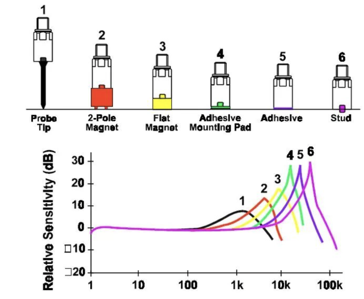 不同的安裝方式會顯著的影響傳感器的諧振頻率,也就是傳感器的高頻響應。下圖有說明安裝方式對諧振頻率的影響。優先選擇螺釘安裝,其次是熱熔膠或瞬干膠,然后雙面膠等等。