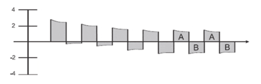 在這個例子中,在一個穩態脈寬和脈沖間隔為一秒的AC耦合壓力應用,產生0-2V電壓輸出信號。其頻率保持不變但信號迅速衰減,直到信號在原始基線上下面積區域A=區域B,而且峰值相同。